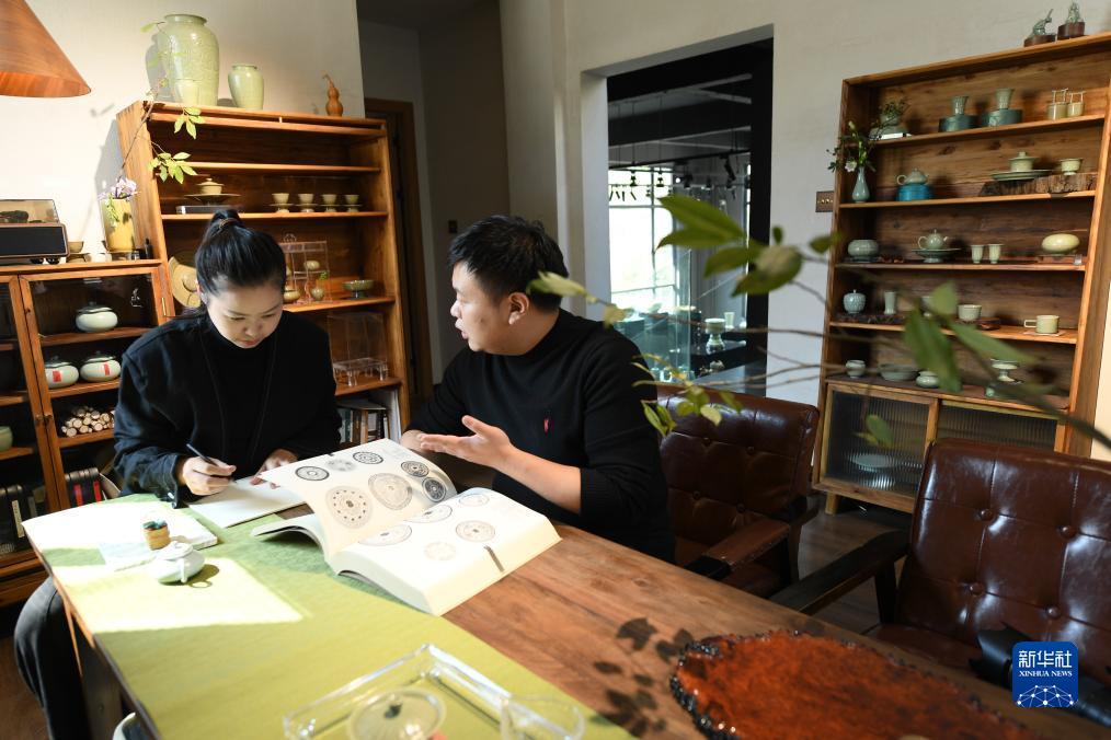 “95后”陶瓷夫妻檔季雙俊和季資美是高中和大學參展時的同學,因為共同的興趣走到一起。從景德鎮陶瓷工藝攤位設計美院畢業后回到故鄉道具製作龍泉,夫妻二人在甌江旁的爐田村駐扎下來,成立了“梅夫人”工作室,潛心鉆研北宋風格的青瓷器。兩人從古瓷展場設計中尋找靈感,力圖重現北宋龍泉窯的胎釉特點,并借鑒青銅器、金銀器、古代服裝上的紋樣,在瓷上傾注對傳統文化的熱愛。